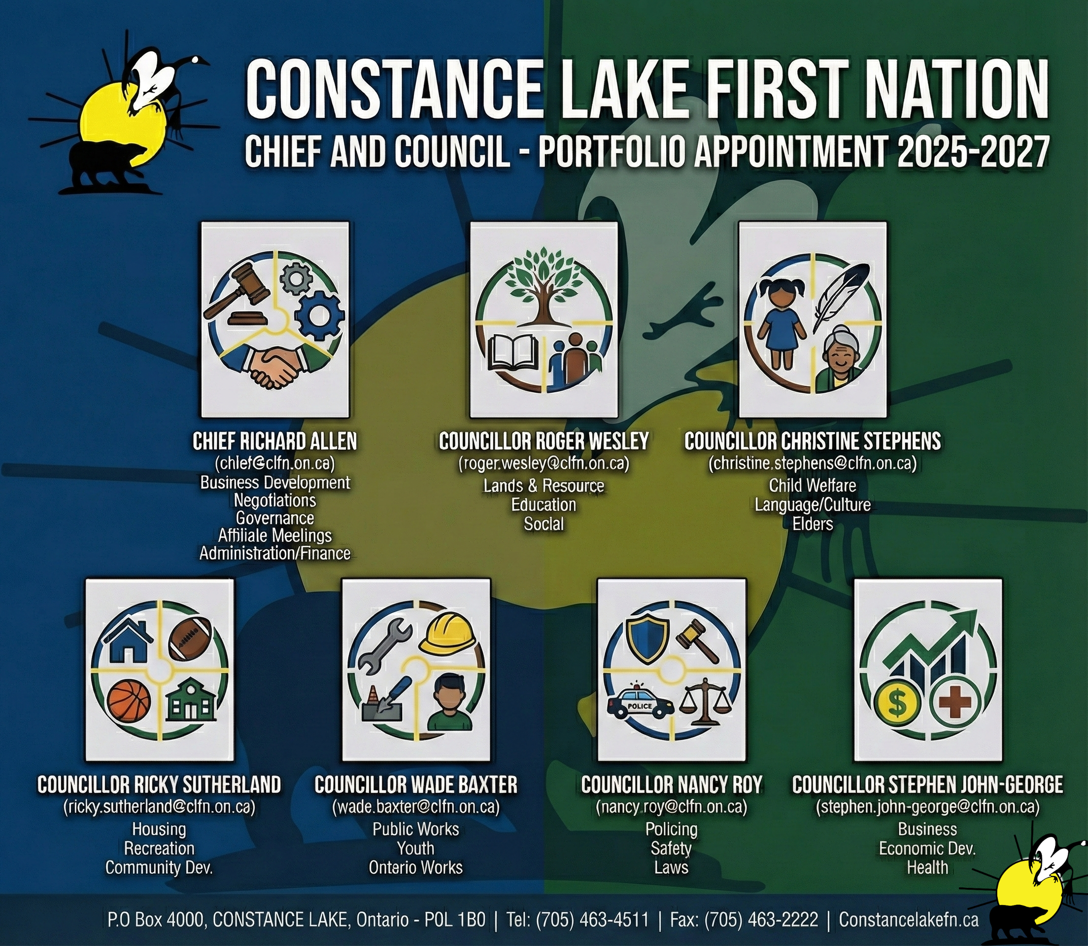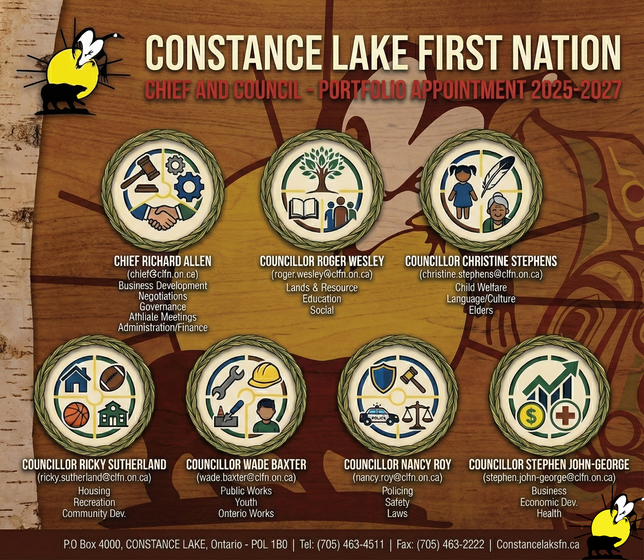 Through their commitment to transparent governance and community engagement, Chief and Council work to advance the wellbeing and prosperity of Constance Lake First Nation.